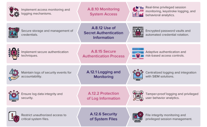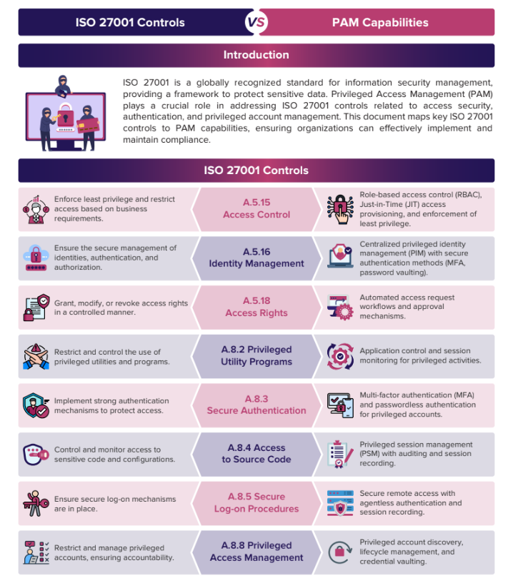 Implementing PAM solutions aligned with ISO 27001 controls helps organizations enhance their security posture, reduce attack surfaces, and ensure compliance. By integrating PAM capabilities, organizations can eectively manage privileged access, enforce least privilege, and maintain audit readiness.